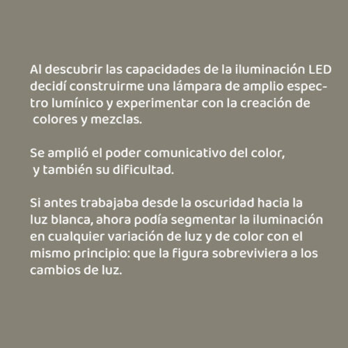 Si antes trabajaba desde la oscuridad hacia la luz blanca, ahora podía segmentar la iluminación en distintos colores, con el mismo principio: que la figura sobreviviera a los cambios de luz.