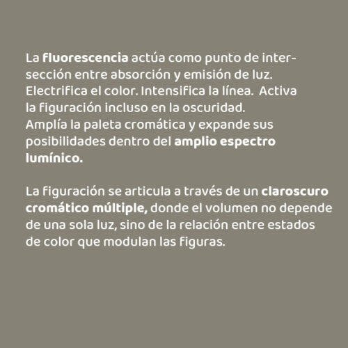 La fluorescencia actúa como punto de intersección entre absorción y emisión de luz. Electrifica el color. Intensifica la línea. Activa la figuración incluso en la oscuridad.