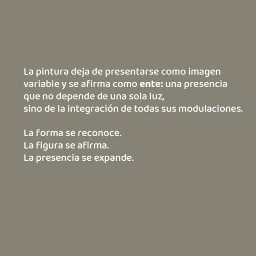 La pintura deja de presentarse como imagen variable y se afirma como ente: una presencia que no depende de una sola luz, sino de la integración de todas sus modulaciones.
