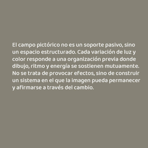 El campo pictórico no es un soporte pasivo, sino un espacio estructurado. Cada variación de luz y color responde a una organización previa donde dibujo, ritmo y energía se sostienen mutuamente. No se trata de provocar efectos, sino de construir un sistema en el que la imagen pueda permanecer y afirmarse a través del cambio.