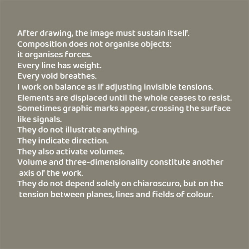 In this context, each decision responds to a balance between the technical and the perceptual, resulting in a practice in which the work is constructed through the relationship between its parts.