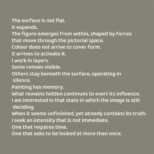 The figure emerges from within, shaped by forces that move through the pictorial space.