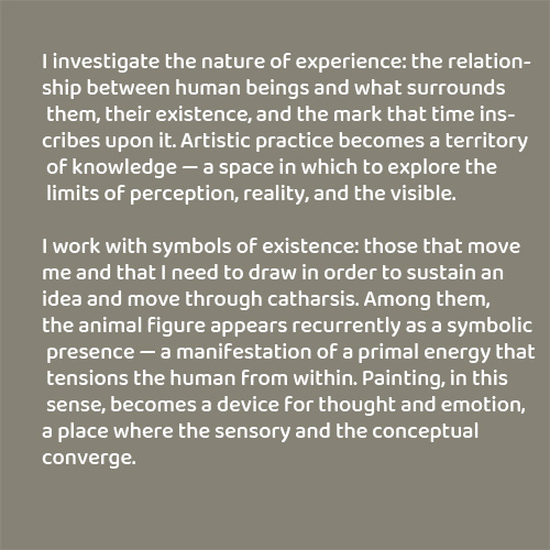 I work with symbols of existence: those that move me and that I need to draw in order to sustain an idea and move through catharsis. Among them, the animal figure appears recurrently as a symbolic presence — a manifestation of a primal energy that tensions the human from within. Painting, in this sense, becomes a device for thought and emotion, a place where the sensory and the conceptual converge.