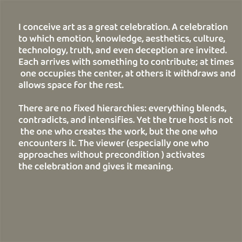 I conceive art as a great celebration. A celebration to which emotion, knowledge, aesthetics, culture, technology, truth, and even deception are invited. Each arrives with something to contribute; at times one occupies the center, at others it withdraws and allows space for the rest. There are no fixed hierarchies: everything blends, contradicts, and intensifies. Yet the true host is not the one who creates the work, but the one who encounters it. The viewer — especially one who approaches without precondition — activates the celebration and gives it meaning.