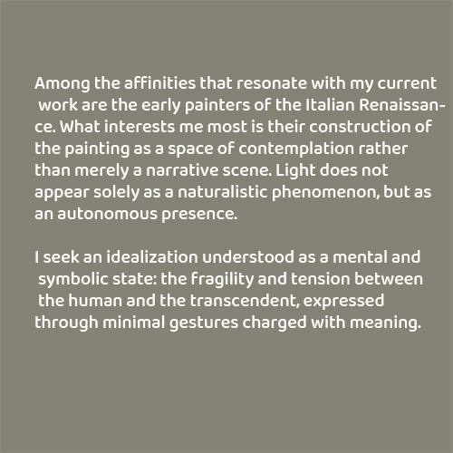 Among the affinities that resonate with my current work are the early painters of the Italian Renaissance. What interests me most is their construction of the painting as a space of contemplation rather than merely a narrative scene. Light does not appear solely as a naturalistic phenomenon, but as an autonomous presence. I seek an idealization understood as a mental and symbolic state: the fragility and tension between the human and the transcendent, expressed through minimal gestures charged with meaning.