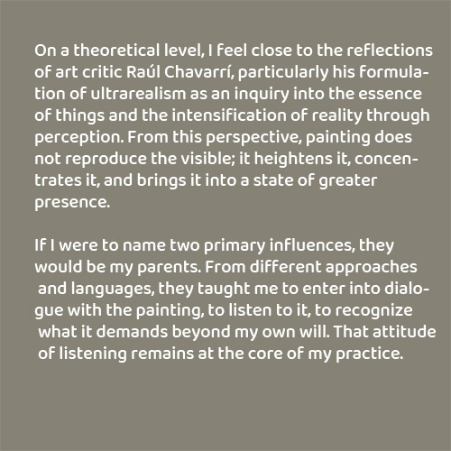 On a theoretical level, I feel close to the reflections of art critic Raúl Chavarrí, particularly his formulation of ultrarealism as an inquiry into the essence of things and the intensification of reality through perception. From this perspective, painting does not reproduce the visible; it heightens it, concentrates it, and brings it into a state of greater presence.