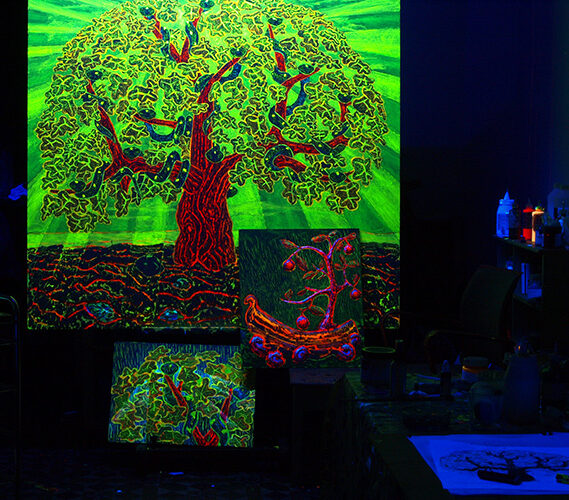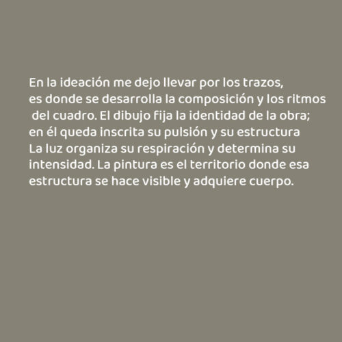 En la ideación me dejo llevar por los trazos, es donde se desarrolla la composición y los ritmos del cuadro. El dibujo fija la identidad de la obra; en él queda inscrita su pulsión y su estructura. La luz organiza su respiración y determina su intensidad. La pintura es el territorio donde esa estructura se hace visible y adquiere cuerpo.