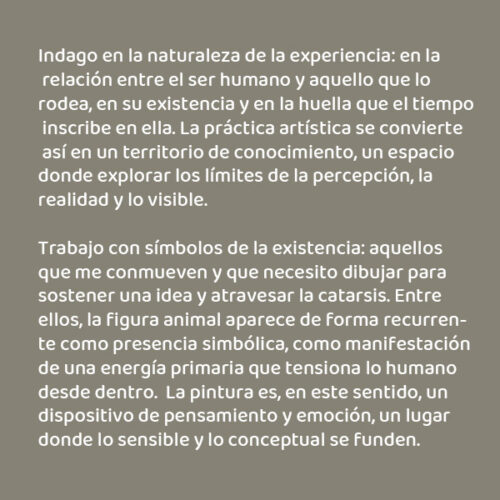 Trabajo con símbolos de la existencia: aquellos que me conmueven y que necesito dibujar para sostener una idea y atravesar la catarsis. Entre ellos, la figura animal aparece de forma recurrente como presencia simbólica, como manifestación de una energía primaria que tensiona lo humano desde dentro. La pintura es, en este sentido, un dispositivo de pensamiento y emoción, un lugar donde lo sensible y lo conceptual se funden.