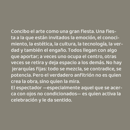 Concibo el arte como una gran fiesta. Una fiesta a la que están invitados la emoción, el conocimiento, la estética, la cultura, la tecnología, la verdad y también el engaño. Todos llegan con algo que aportar; a veces uno ocupa el centro, otras veces se retira y deja espacio a los demás. No hay jerarquías fijas: todo se mezcla, se contradice, se potencia. Pero el verdadero anfitrión no es quien crea la obra, sino quien la mira. El espectador —especialmente aquel que se acerca con ojos no condicionados— es quien activa la celebración y le da sentido.
