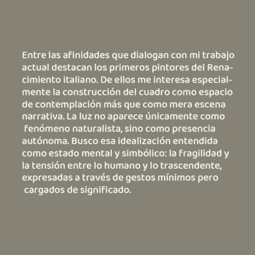 Entre las afinidades que dialogan con mi trabajo actual destacan los primeros pintores del Renacimiento italiano. De ellos me interesa especialmente la construcción del cuadro como espacio de contemplación más que como mera escena narrativa. La luz no aparece únicamente como fenómeno naturalista, sino como presencia autónoma. Busco esa idealización entendida como estado mental y simbólico: la fragilidad y la tensión entre lo humano y lo trascendente, expresadas a través de gestos mínimos pero cargados de significado.