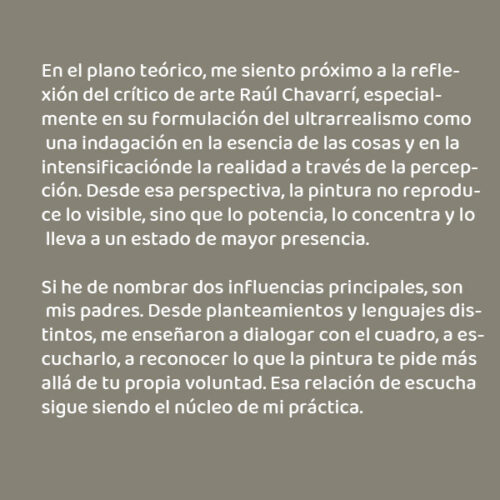 Si he de nombrar dos influencias principales, son mis padres. Desde planteamientos y lenguajes distintos, me enseñaron a dialogar con el cuadro, a escucharlo, a reconocer lo que la pintura te pide más allá de tu propia voluntad. Esa relación de escucha sigue siendo el núcleo de mi práctica.