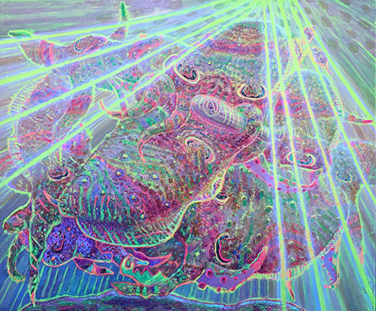 En este contexto, las pinturas del proyecto Latent Paintings se mostraban como superficies de gran densidad material. Los cuadros revelaban una atención muy precisa hacia la materia pictórica. Rocas, plantas, pieles o paisajes submarinos parecían surgir de la superficie bajo un aspecto epitelial extraño y vibrante generado por los craquelados. Más que representar un paisaje submarino, las obras parecían construirlo desde la propia fisicidad del pigmento. La pintura no representa el paisaje submarino: lo construye desde la materia del pigmento.