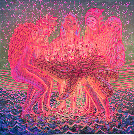 La luz desempeña aquí un papel decisivo. No actúa como foco externo que modela volúmenes, sino como cualidad epidérmica. Bajo distintas intensidades, el color parece desplazarse por la superficie de los cuerpos, intensificarse o apagarse, como si la pintura recogiera la lógica de ciertas mutaciones marinas. La iluminación no revela únicamente formas; altera su estabilidad.
